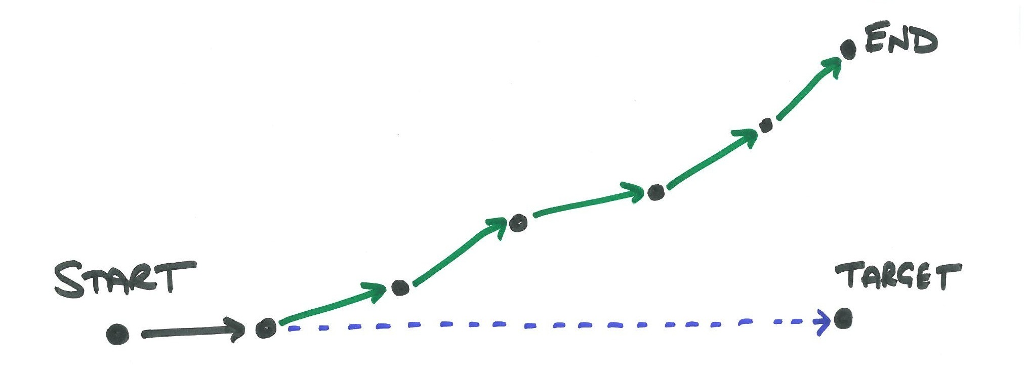 In my head this is always represented with the following diagram. Where the blue dotted line indicates the original direction we thought was going to be right for the project (or codebase, or process, etc), the black dots represent reflection points, and the green lines represent the course corrections that were taken to improve things. At the end of the project, we ended up with a product or a way of working that we would never have envisaged at the start.