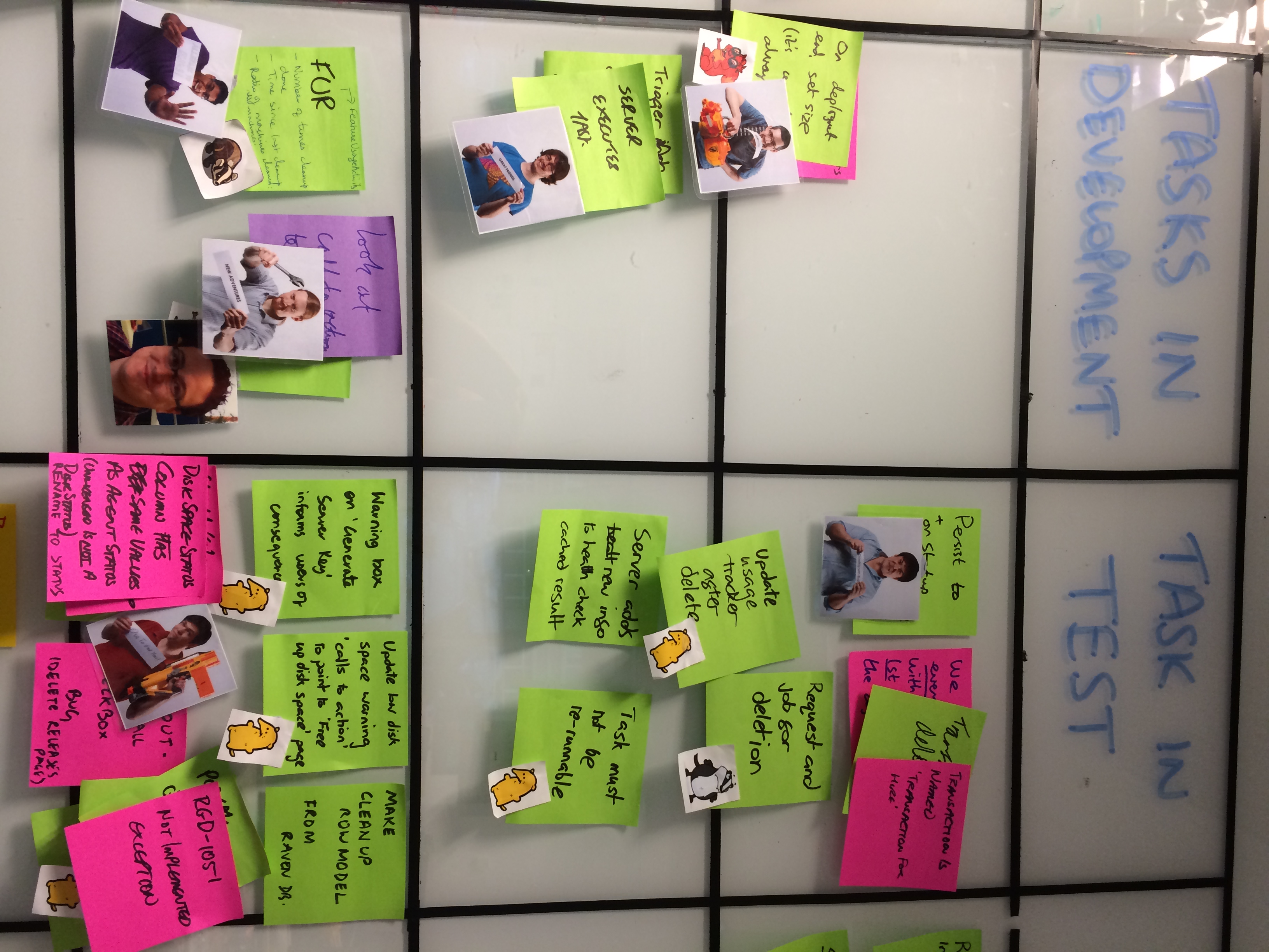 This experiment has had the desired effect, as progress on our current feature has been excellent. We’ve ‘swarmed’ on that one thing – meaning the entire team has worked on developing a single feature. You can see that from the picture below showing the team’s faces on the whiteboard, representing what people are working on. The team members’ avatars (cheesy pictures) are close together (all three rows are for the same feature, btw). In addition, everyone understands the feature at a technical and functional level, and it truly feels like the team’s work.