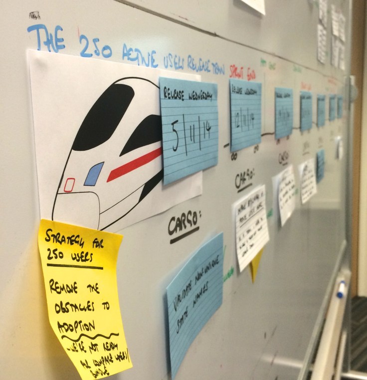 In the end, we fashioned a release plan made up of 6 weekly, iterative releases. Vital functionality was front-loaded into the early releases and nice-to-haves had settled at the end. As each release was scheduled for a Wednesday, and any functionality that was not ready for that day would have to wait for the following Wednesday – we had an Agile Release Train (see below, cut-out train and carriage wheels were an optional but metaphor anchoring extra).