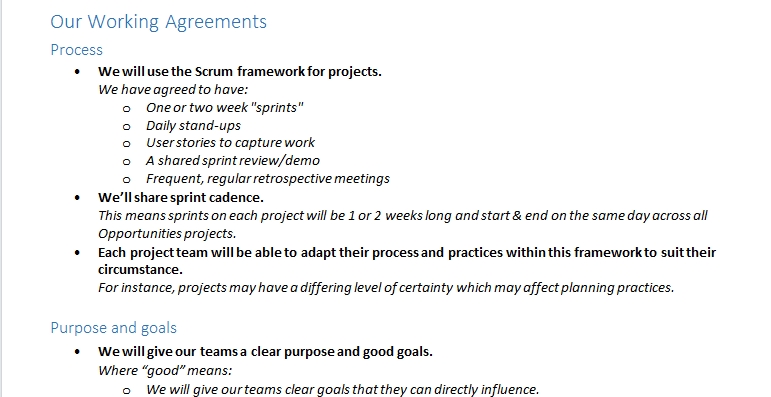 Therefore the project managers (who are effectively team leaders) in my division decided to develop a set of “working agreements” calling out best practices we have experienced (such as retrospective meetings) and the aims we have (such as delivering frequently) with a view to embedding these in all projects in the division and encouraging consistency. We tried to identify the right things to do in the general case, to find universally useful practices that would be of benefit in most cases. We did not gather a superset of all the practices across our teams, with a view to homogenize every aspect of how we work.