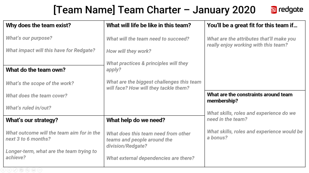 In January 2021 Redgate’s product development organisation will undertake a “reteaming” process to reconfigure how our teams are assigned to reflect the company’s strategy for 2021. Our approach to these team changes will allow people to strongly influence where in the new team structure they will work, encouraging them to move towards the work they find most engaging.