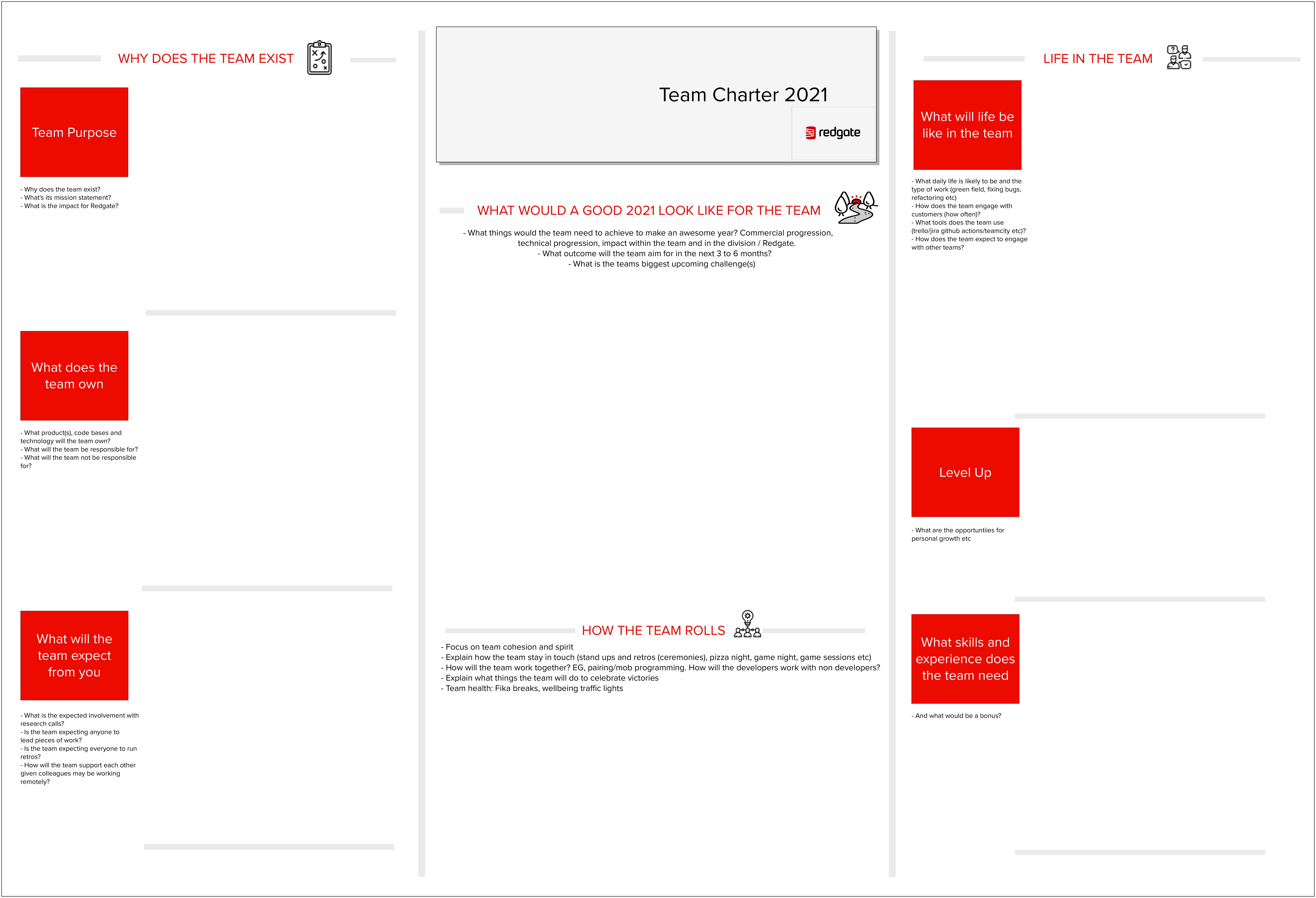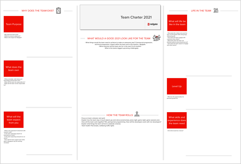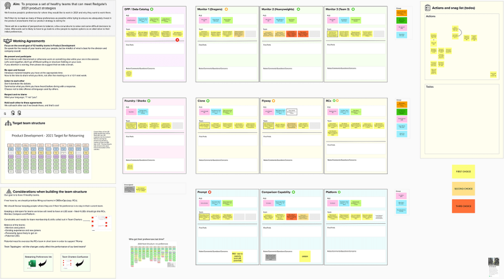 In January 2021 Redgate’s Product Development organisation embarked on our annual “reteaming” process to reconfigure how our teams are assigned to reflect the company’s 2021 strategy and plans. For the last 3 years, our approach to these team changes has been to allow people to strongly influence where in the new team structure they will work, encouraging them to move towards the work they find most engaging. This year, for the first time, we had to run reteaming as a fully-remote process.
